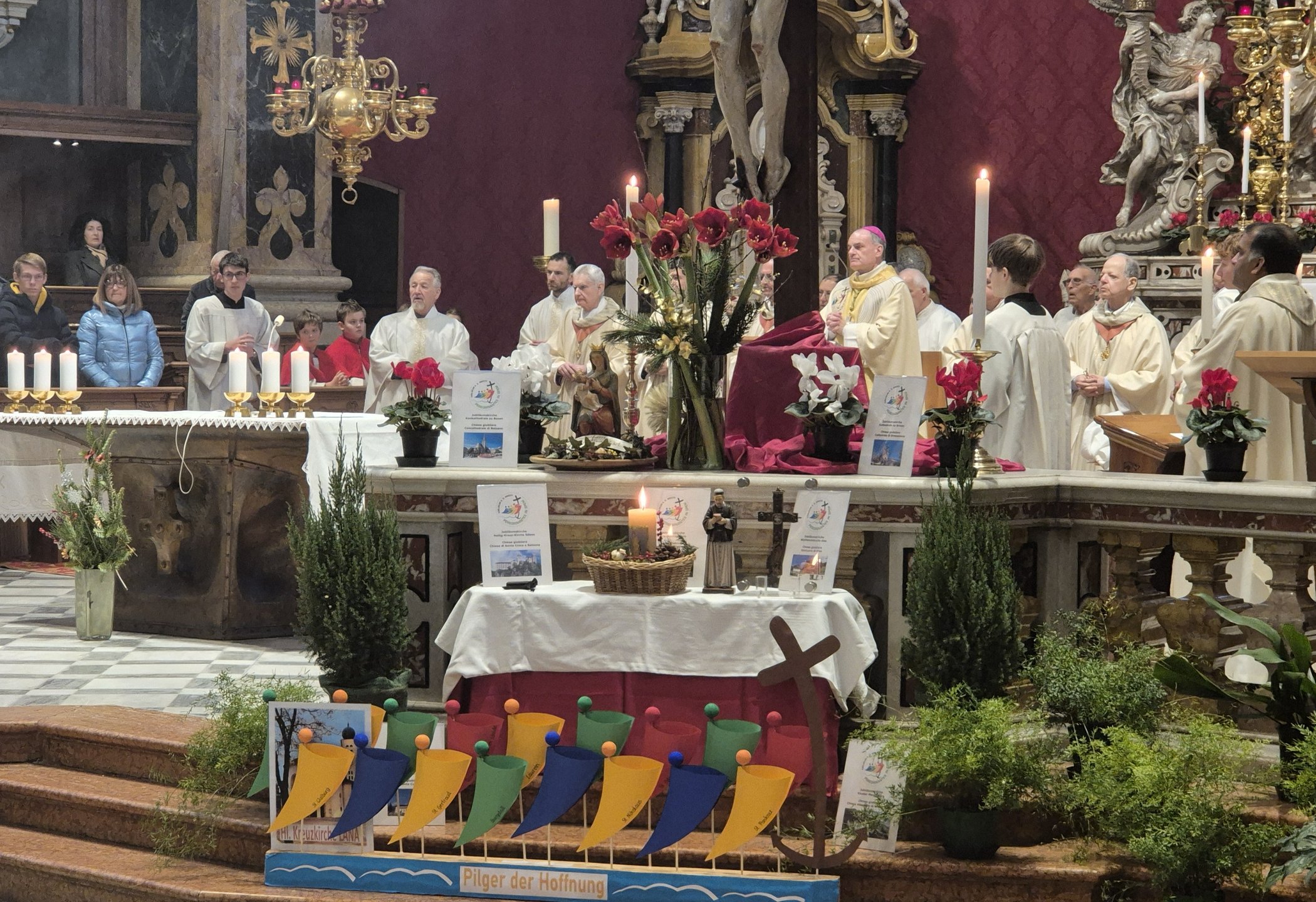 Der Gottesdienst war von besonderen Zeichen des gemeinsamen Weges geprägt. Beim feierlichen Einzug brachten Vertreterinnen und Vertreter der Jubiläumskirchen aus Brixen, Bozen, Maria Weißenstein, Oies, Lana und Säben symbolische Zeichen ihrer Kirchen zum Altar und legten sie beim Jubiläumskreuz nieder. Persönliche Wortmeldungen von Teilnehmenden an diözesanen und internationalen Jubiläumsfeiern gaben Einblick in Erfahrungen des Glaubens und der Gemeinschaft.
